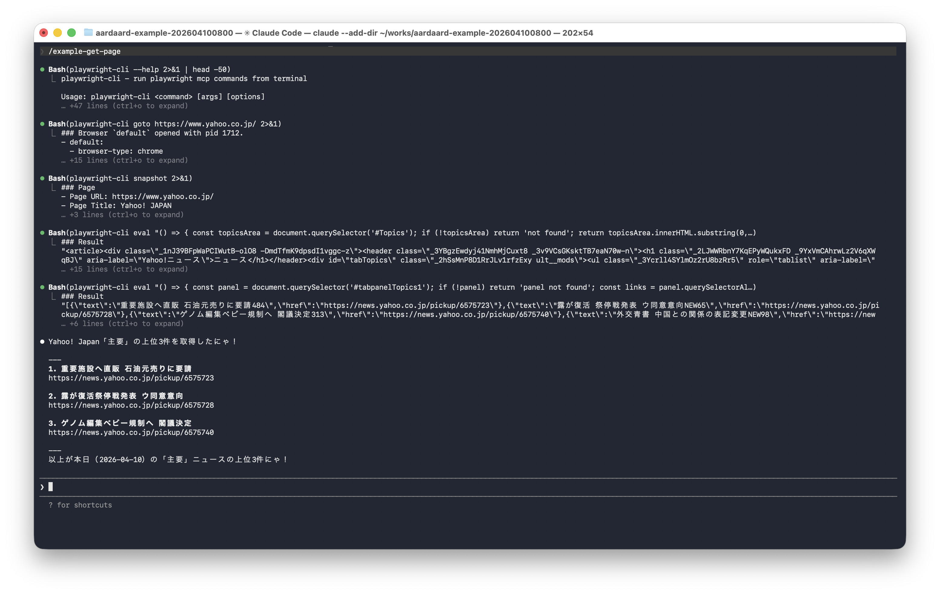 `https://www.yahoo.co.jp/` にアクセスし「主要」の記事の上位の3件を取得・表示